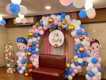 Customized baby-shower themes with balloons, backdrops, props, and coordinated color palettes.